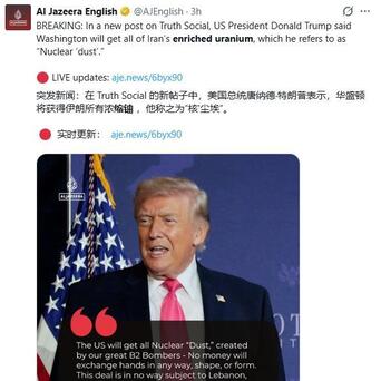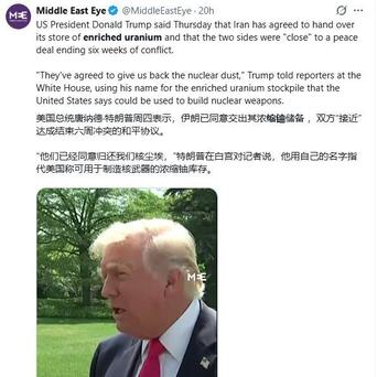 紧接着,特朗普在社交媒体甩出一句狠话:“美国将获得伊朗所有核‘尘埃’,不会以任何方式、任何形式支付任何款项。”